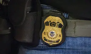A federal agent wears a badge of Immigration and Customs Enforcement while standing outside an immigration courtroom at the Jacob K. Javits Federal Building in New York, on June 10, 2025.