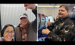 Heller and her father-in-law, happy to be off the plane; Frank Granati, eager to get to Detroit.