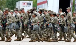 Members of the Texas National Guard assemble in Elwood, Ill., at the Army Reserve Training Center in the southwest suburb of Chicago on Tuesday.
