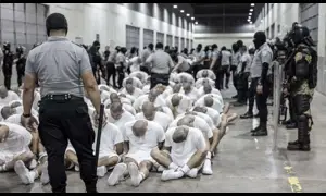 A prison guard transfers Alien Enemies Act deportees from the U.S., alleged to be Venezuelan gang members, to the Terrorism Confinement Center in Tecoluca, El Salvador. Mar. 16, 2025 (El Salvador Presidential Press Office)